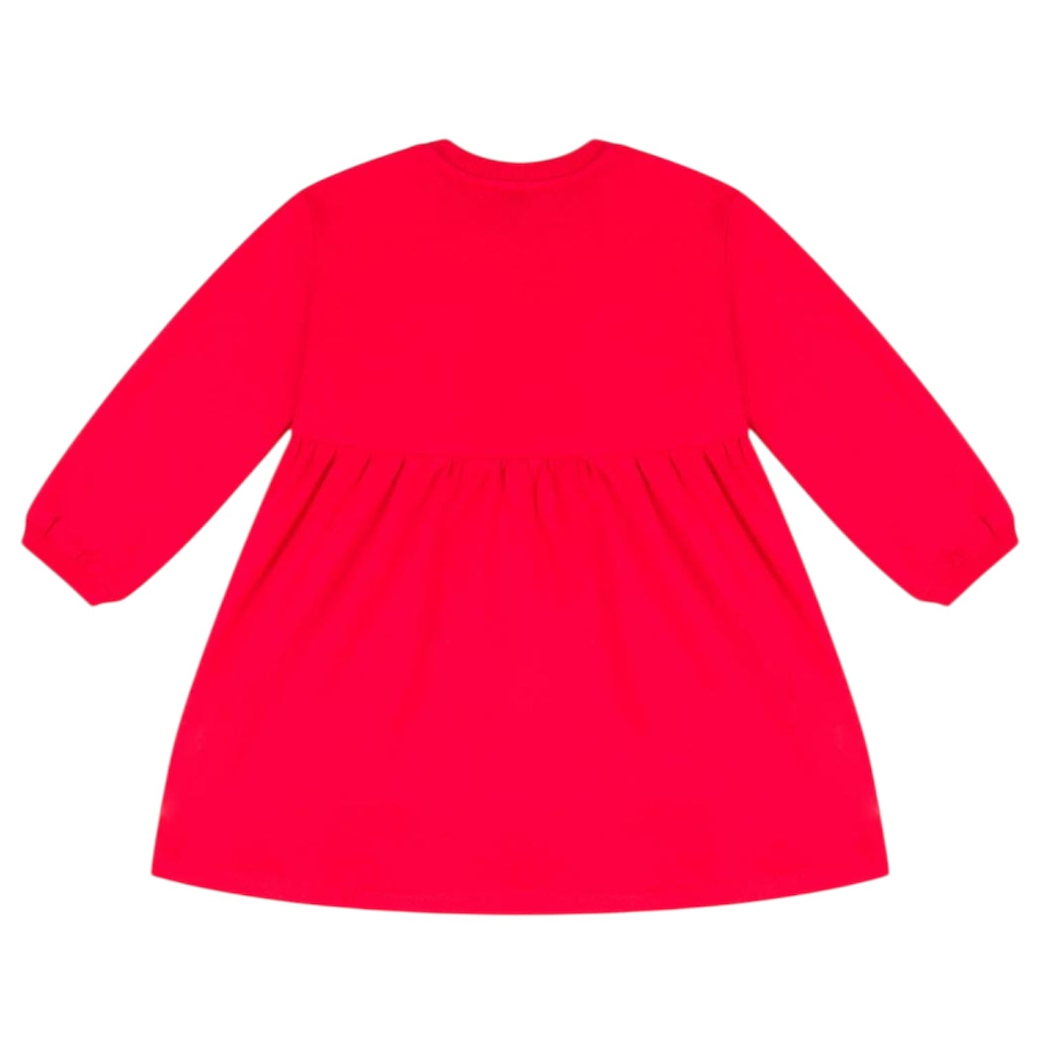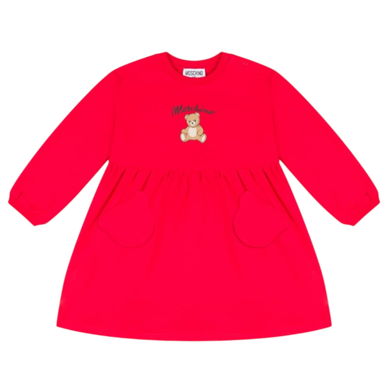 Abito girocollo Moschino realizzato in felpa di cotone. Chiusura con bottoni automatici sulla parte superiore della spalla, stampa sul petto Teddy Bear con logo, maniche lunghe con i polsini rifiniti a costine. Il capo viene reso particolare dall’ applicazione di due tasche a forma di Teddy Bear e fondo a balza.