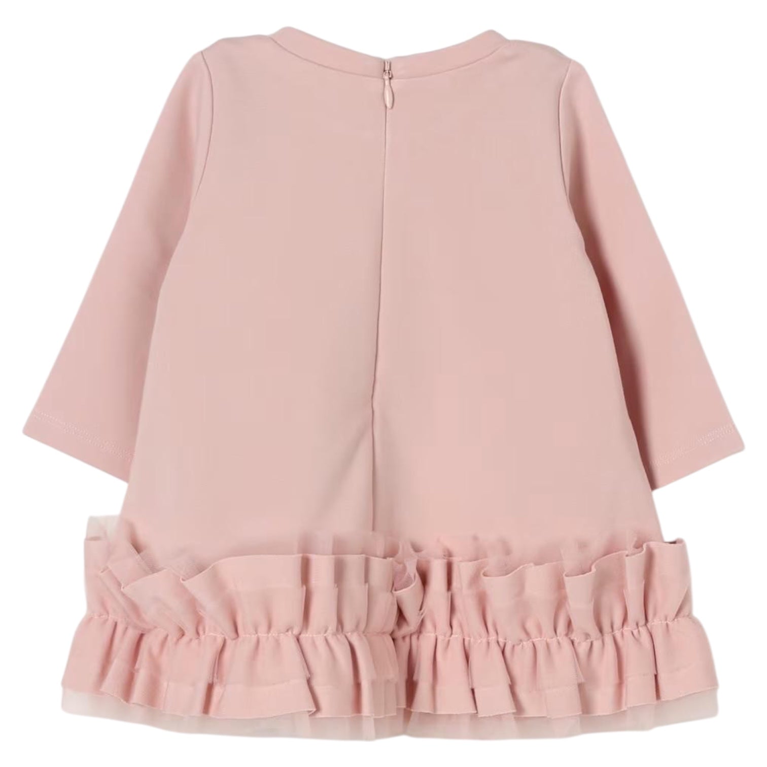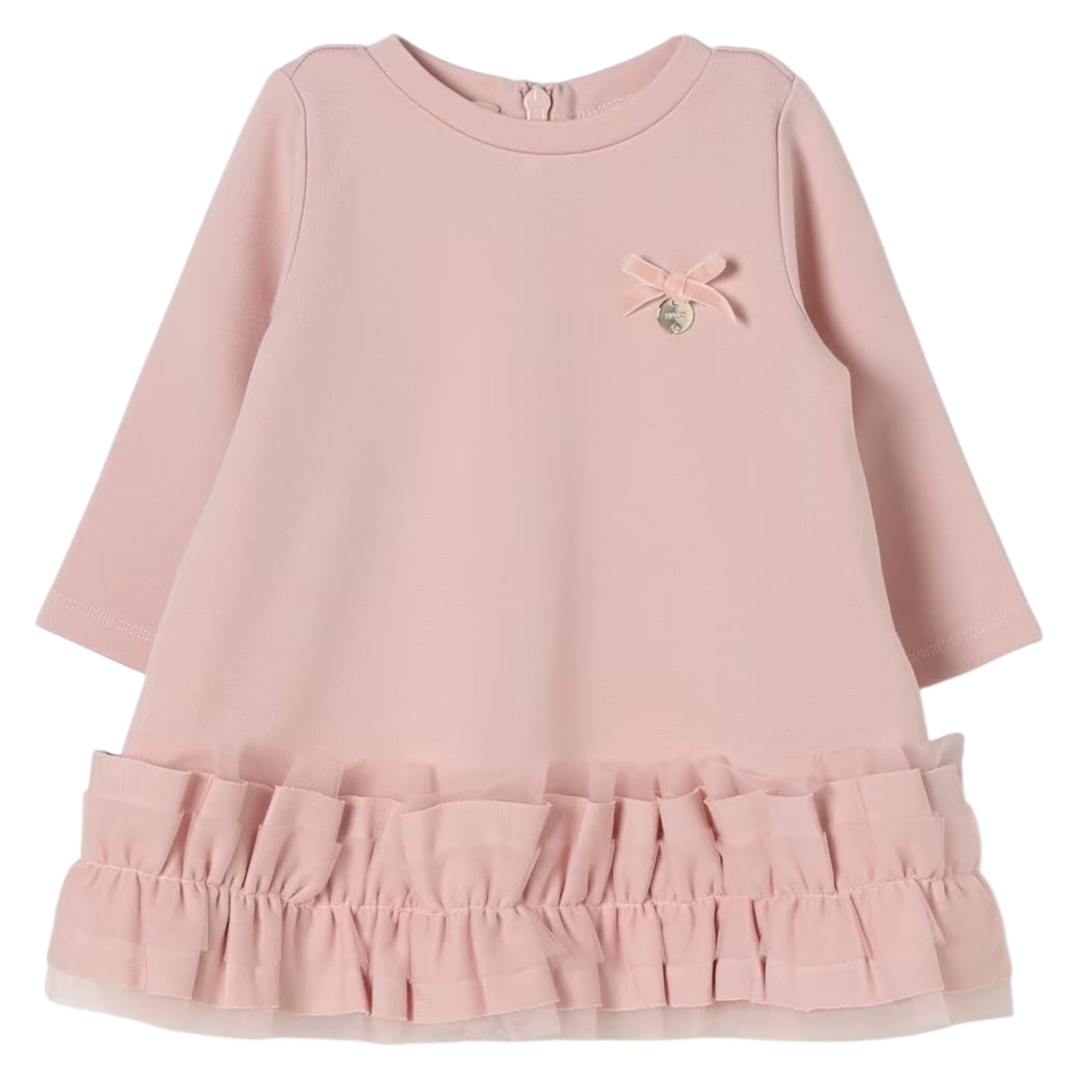 Abito Liu-Jo girocollo a maniche lunghe di forma svasata. Il capo viene impreziosito sul fondo da una balza con rouches e da un fiochetto in velluto con una medaglietta riportante il logo sul petto. Chiusura con zip a scomparsa sul retro.