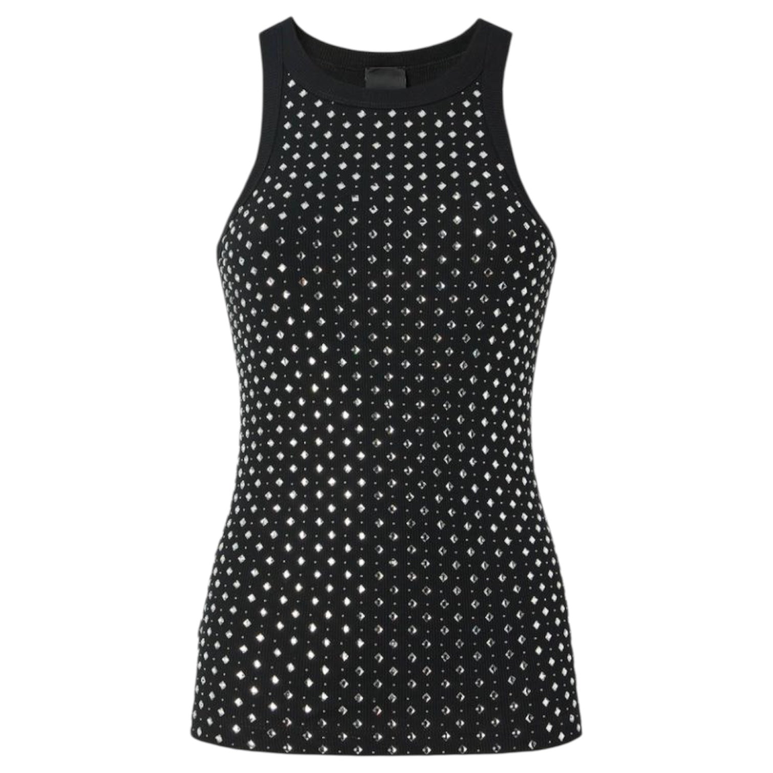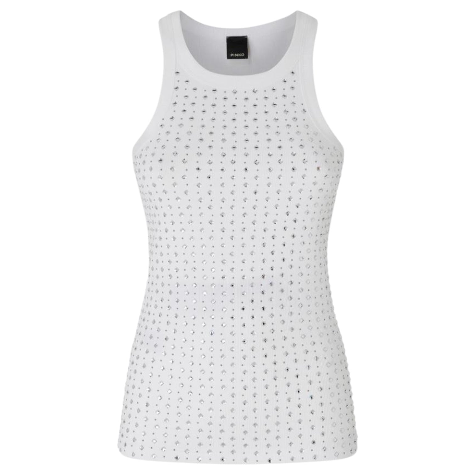 Canotta Pinko con scollo a vogatore dalla vestibilità aderente in misto cotone. Il Top è realizzato con una lavorazione a costine e impreziosito da un motivo di mini borchie e strass dalla forma romboidale sul davanti.