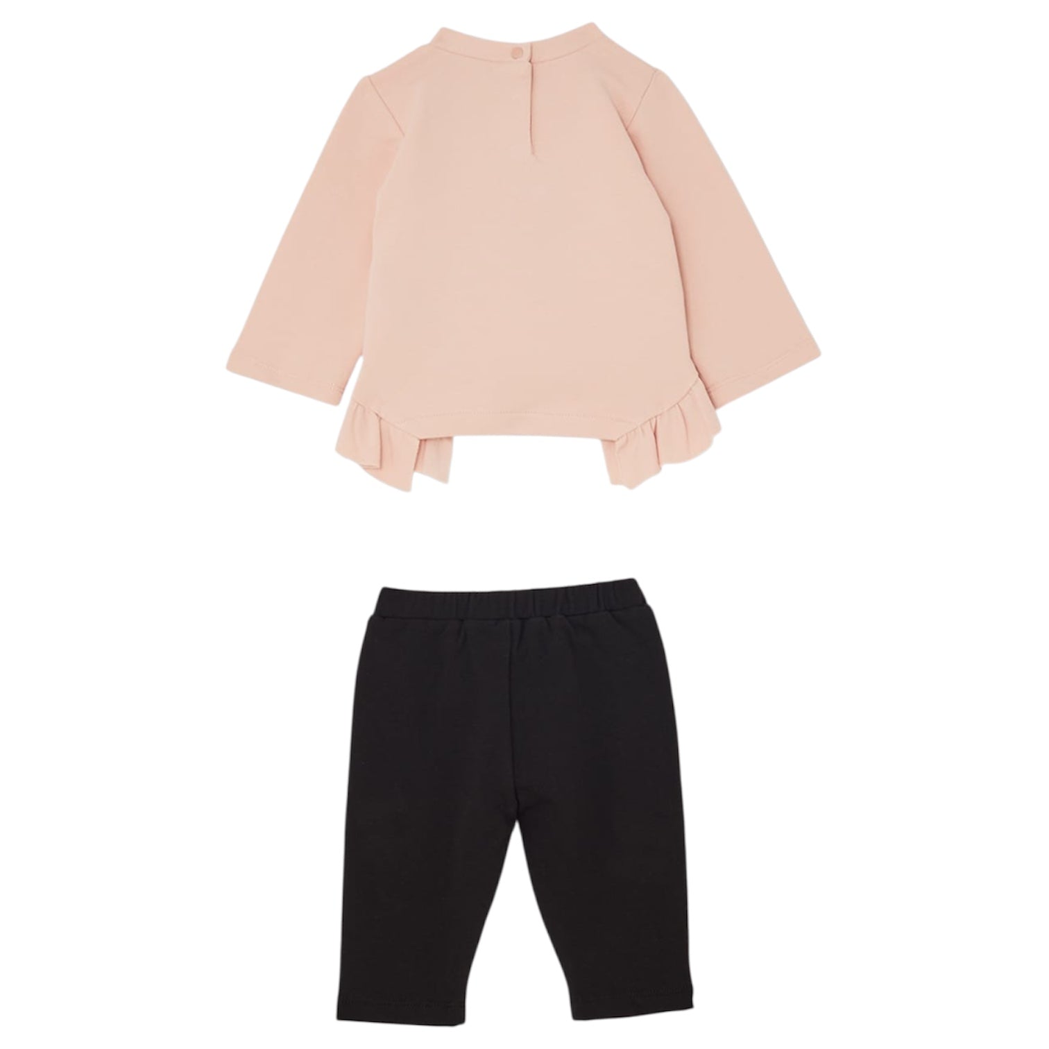 Completo pantalone Liu-Jo realizzato in felpa di cotone, taglio girocollo con chiusura a bottone sul retro. Maglia con stampa e fiocchetto arricchita da strass e rouches sui lati. Pantalone con elastico in vita.