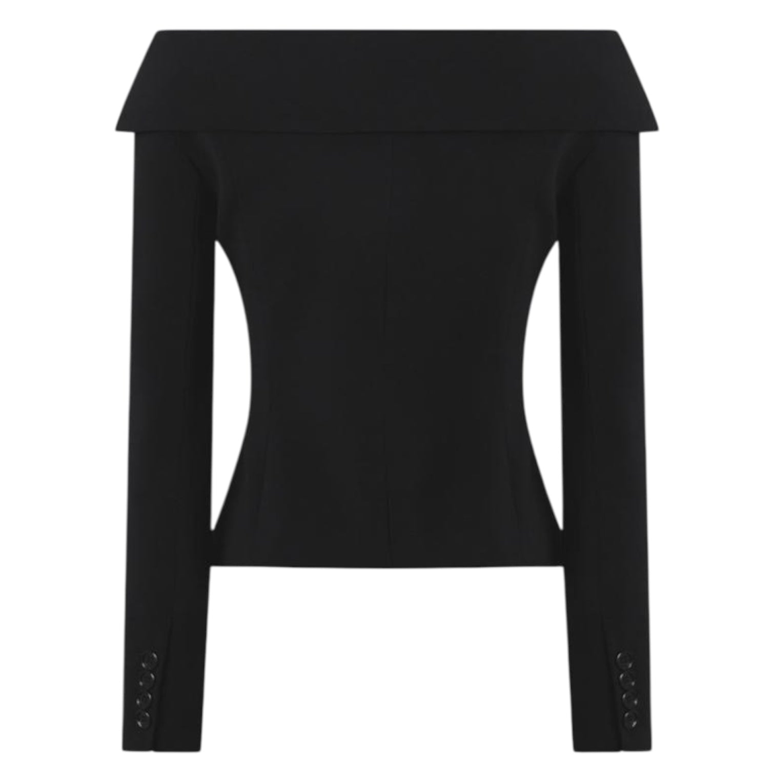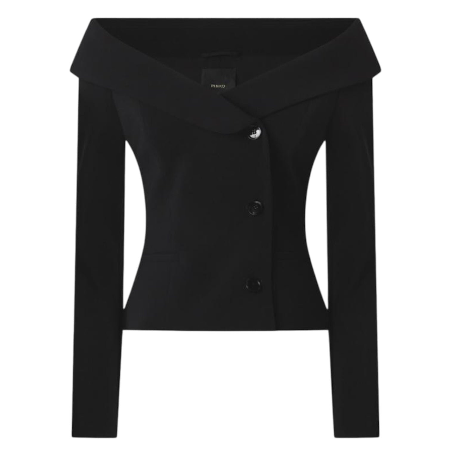Giacca aderente Pinko realizzata in tessuto crêpe stretch. L’ abbottonatura è decentrata, i polsini presentano dei bottoni, tasche laterali a filetto e lo scollo molto ampio lascia le spalle scoperte.