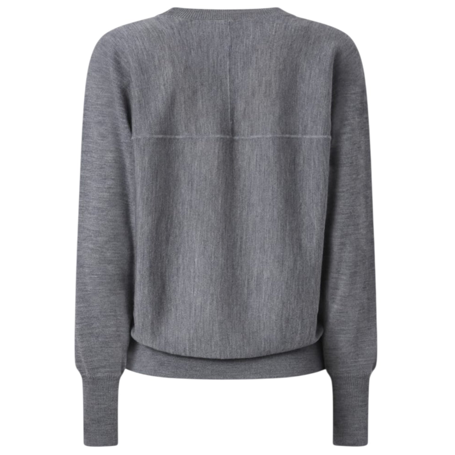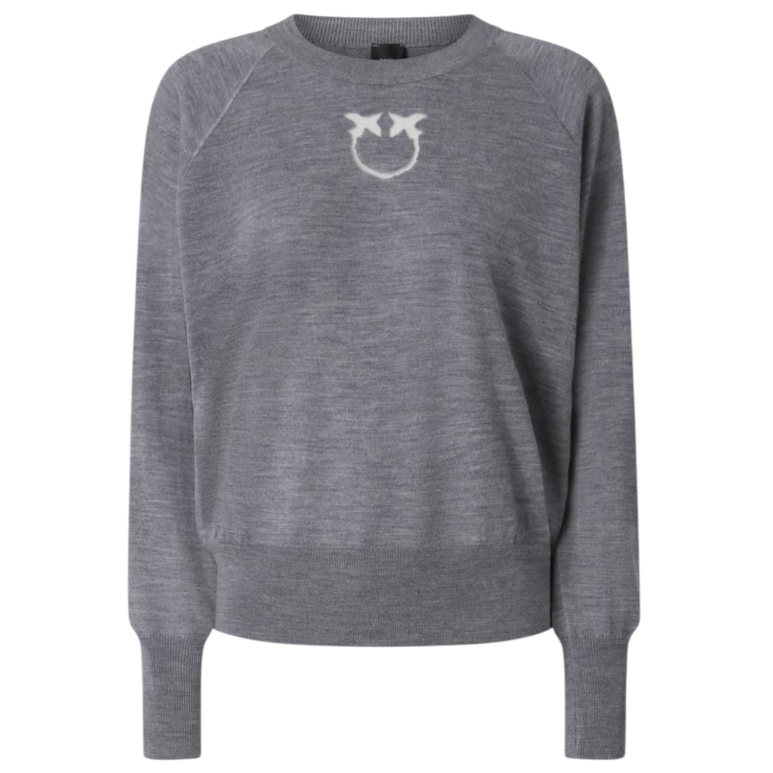 Maglia Pinko girocollo a maniche lunghe in pura lana merino. Sul davanti la maglia è arricchita dal logo Love Birds sotto forma di intarsio in trasparenza lavorato con la tecnica dévoré. Girocollo, orlo e polsini sono lavorati a coste e sul retro del capo possiamo una cucitura a vista.