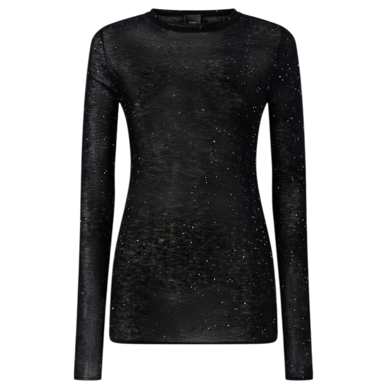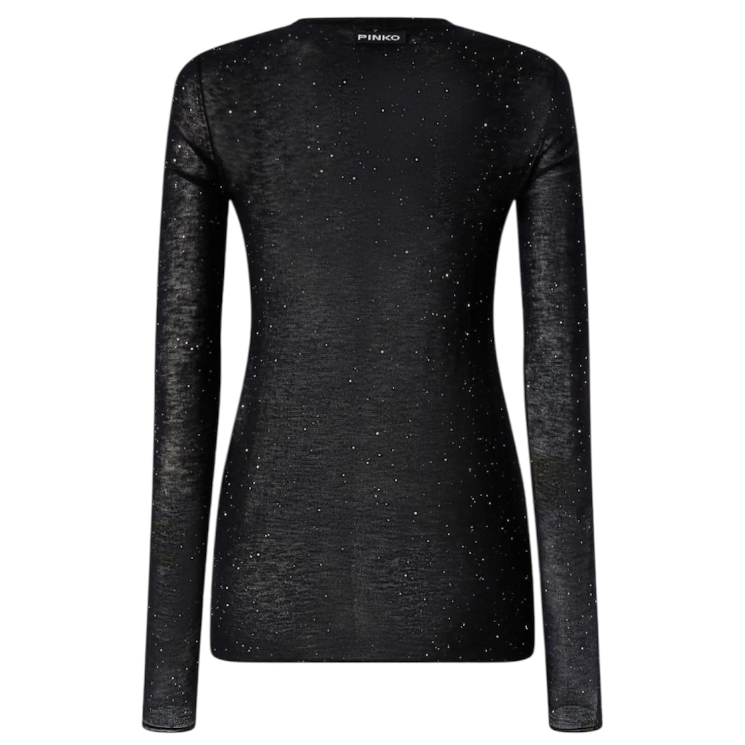 Maglia girocollo Pinko in misto lana realizzata con un filato semitrasparente dalla texture morbida. Il capo è impreziosito da micro paillettes inserite nel filo che donano luminosità alla maglia. Sul retro troviamo una particolare etichetta con logo lettering PINKO