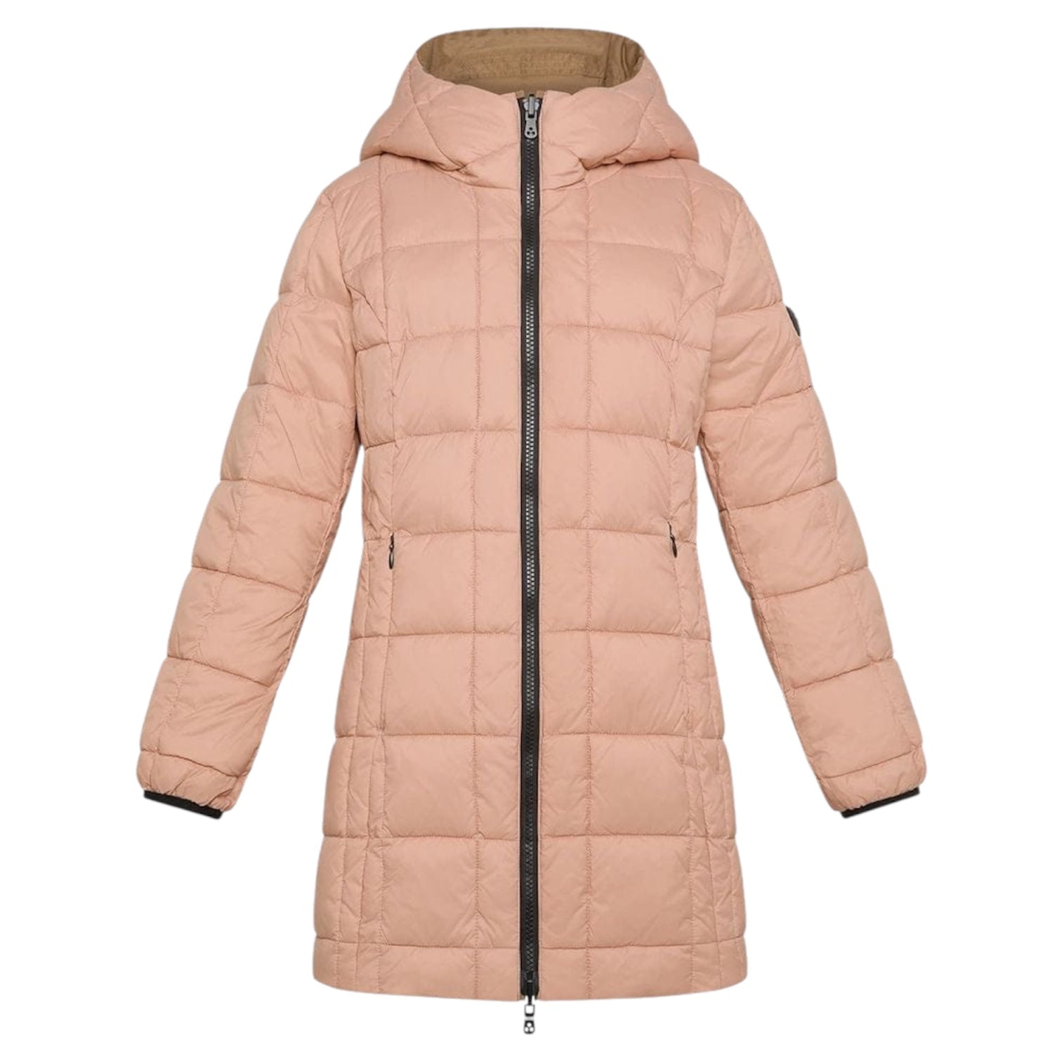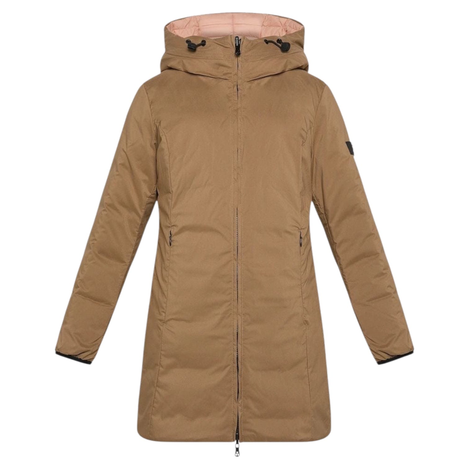Piumino Peuterey lungo reversibile, da un lato liscio color gianduia e dall ‘ altro trapuntato nel colore rosa. Chiusura centrale invisibile con doppio cursore e tasche laterali.