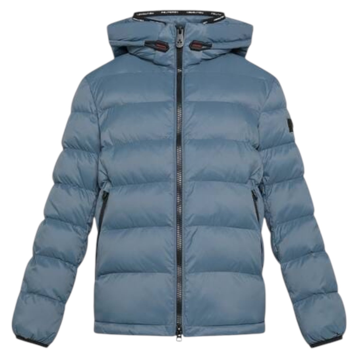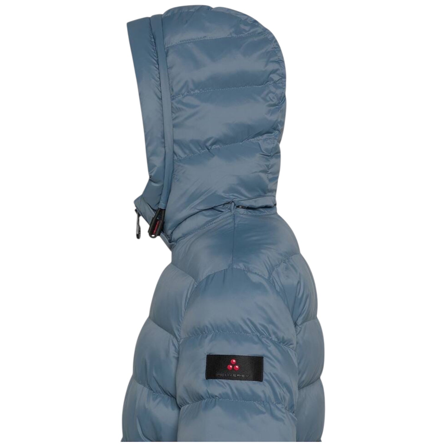 Piumino Peuterey trapuntato con imbottitura in vera piuma, cappuccio removibile e collo alto full zip. Chiusura centrale con zip doppio cursore, collo e polsini bordati con tessuto logato.