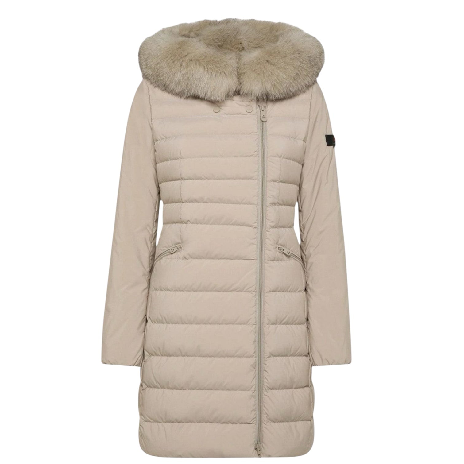 Piumino trapuntato Peuterey dal taglio sagomato con cappuccio fisso arricchito da una bordatura in pelliccia vera, removibile. Chiusura decentrata con  zip doppio cursore tono su tono, tasche oblique con cerniera, maniche in tessuto liscio con polsini elasticizzati.