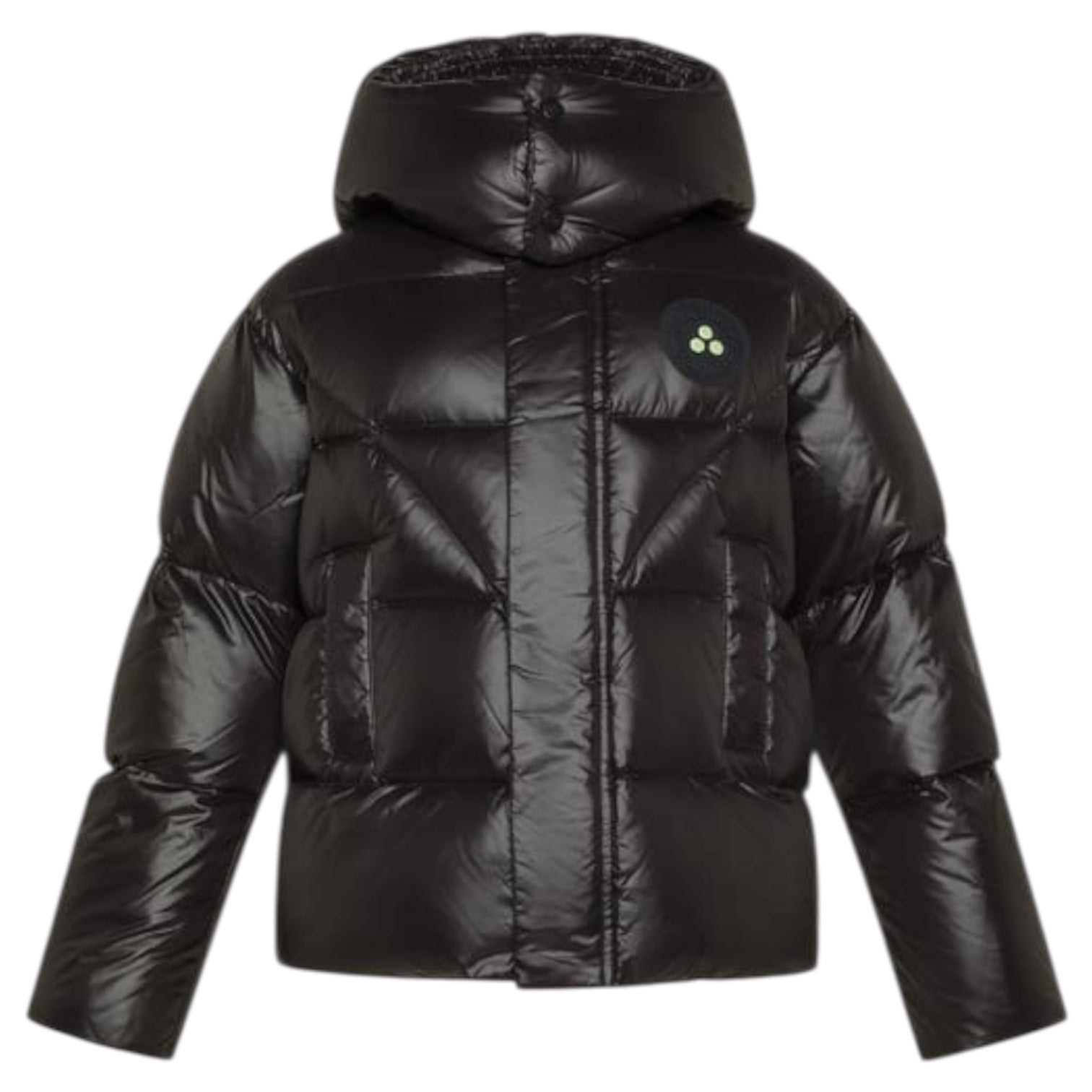 Puffer jacket Peuterey realizzato in nylon lakké lucido. Il cappuccio ispirato alla forma di una balaclava e chiudibile con bottoni a pressione. Il retro è reso particolare da una trapuntatura a V. Il capo presenta una chiusura centrale in zip è nascosta da una patta, maxi logo tondo sul petto, tasche  laterali con chiusura bottone nascosto e coulisse sul fondo. L ‘ imbottitura interna è in piuma naturale certificata mentre l ‘ esterno è realizzato con un tessuto idrorepellente e resistente al vento.