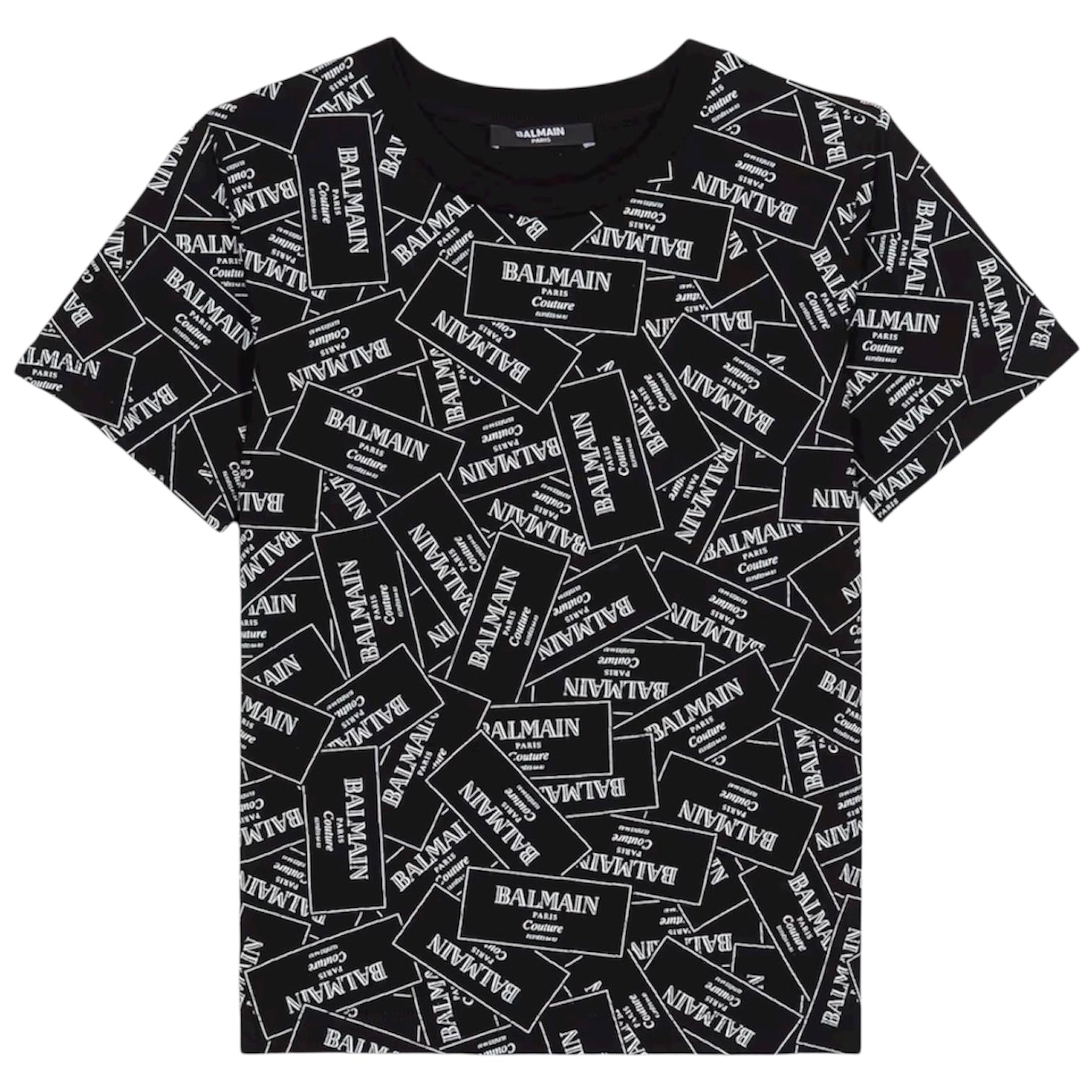 T-shirt Balmain a mezza manica girocollo con finitura a coste. Il capo presenta una stampa logo Balmain Couture all-over a contrasto.