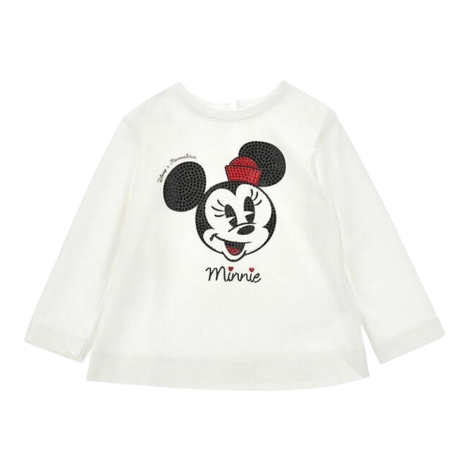 T-shirt Monnalisa a maniche lunghe realizzata in morbido jersey. La maglia presenta sulla parte frontale una stampa di Minnie impreziosita da strass di diversi colori e dimensioni. Chiusura a bottone sul lato posteriore.